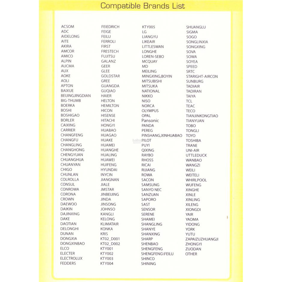 Universal air conditioner remote control manual. Applicable brand and code list. One brand may have different several codes. Ensure the air conditioner is plug into the power source.